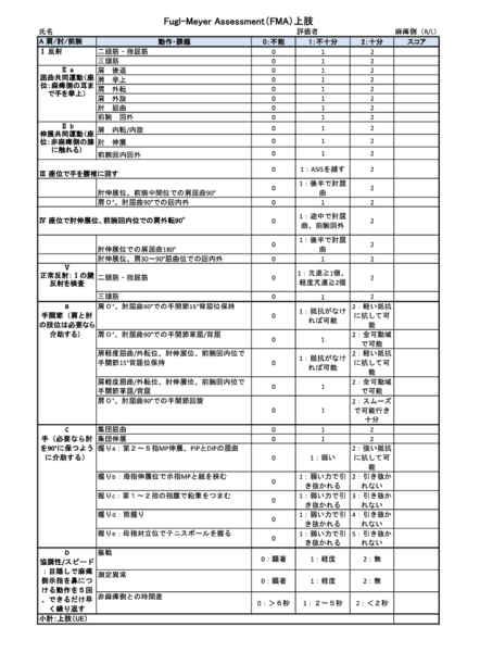 脳卒中などによる片麻痺のリハビリでは、回復の度合いを客観的に把握する評価が欠かせません。 その中でも国際的に広く利用されているのが Fugl-Meyer Assessment(フーグル・マイヤー評価:FMA) です。 FMAは上肢・下肢の運動機能を回復段階に沿った5段階条件で細かく評価し、さらに手関節・手指機能や協調性まで含めて0・1・2点の3段階で採点します。 加えてバランス・感覚機能・他動関節可動域・関節運動時痛も評価対象とし、運動機能のみで100点、全体で226点満点という詳細な構成を備えています。 他の評価法と比べ、機能回復の把握に優れた精密さを持つ一方で、検査に時間を要する点が臨床上の課題とされています。 このブログでは、Fugl-Meyer Assessment(FMA)上肢の評価の流れや各項目の特徴、実際の評価表や注意点を交えながら詳しく紹介していきます。